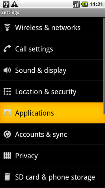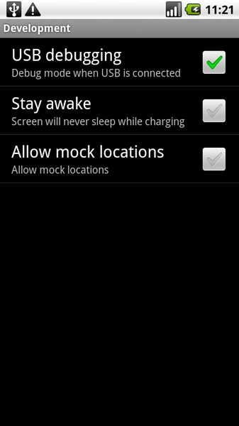 然後點Settings,接著照圖片點選Alpplications->Develpoement->將USB Debugging打勾