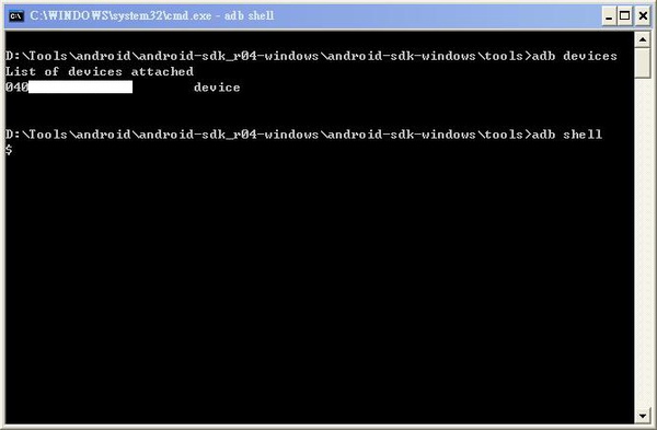 有的話接著再輸入: adb shell,按enter後會出現 $ 符號,這樣就對了。